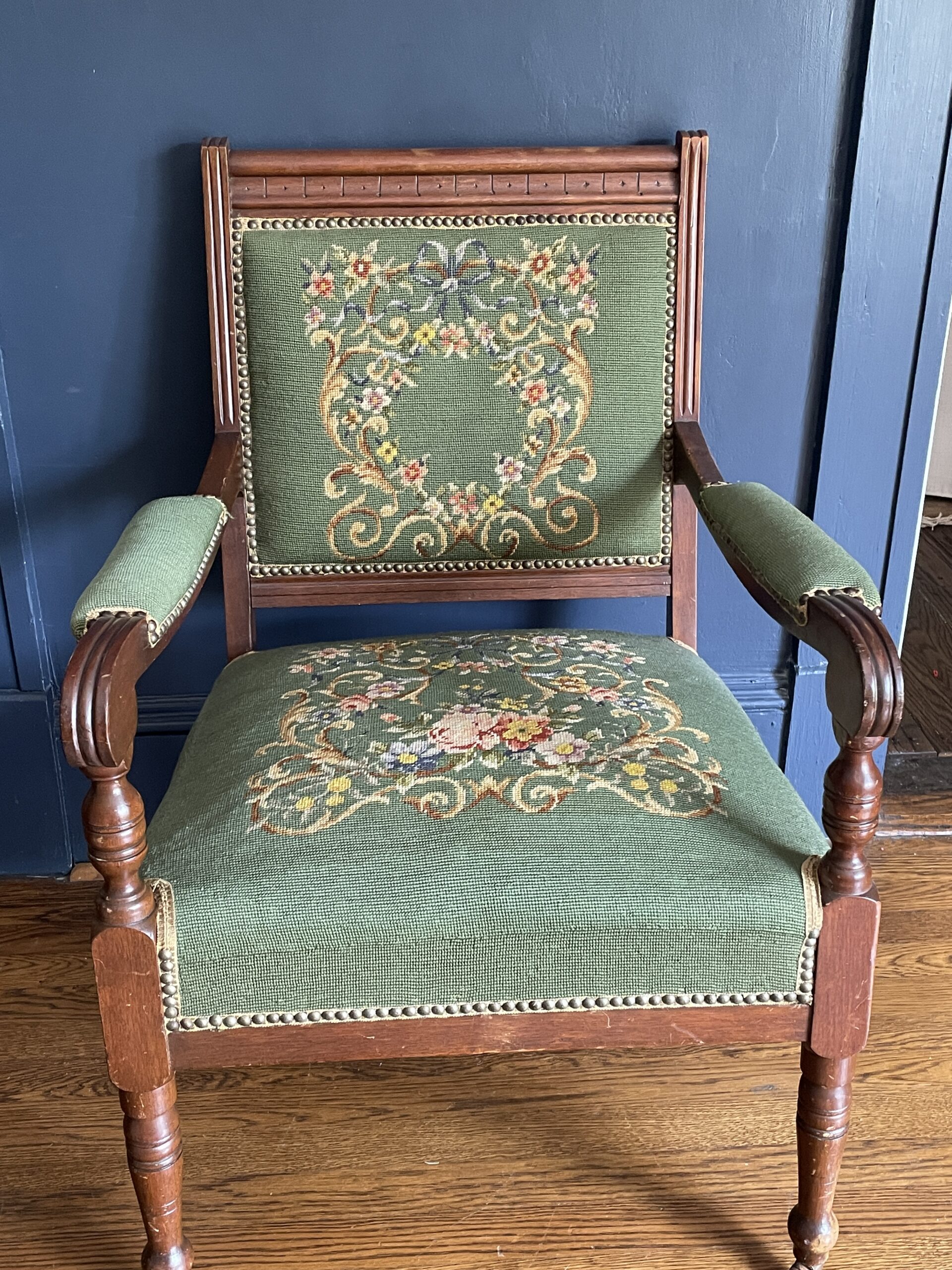 This Eastlake-style parlor chair beautifully embodies that spirit. Its hand-stitched wool needlepoint, with delicate floral garlands on a soft sage ground, reflects both patience and artistry. The solid walnut frame features Eastlake’s signature incised carvings, turned front legs, and brass casters—a refined yet honest alternative to the overblown Rococo styles that came before. Beneath the seat, hand-tied coil springs still offer that satisfying, gently buoyant comfort unique to authentic Victorian upholstery.